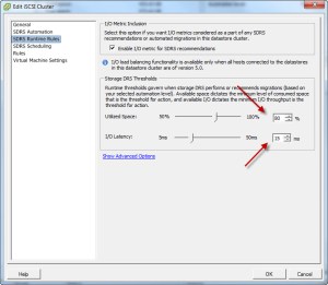The first one is “Utilized Space” which monitors the %Full of your Datastore. Once it hits your threshold, depending on if you’ve selected “Manual Mode” or “Fully Automated” it will either prompt you, or it will SvMotion your VM’s around to free up space. I’ll go into more detail at a later date !! The other thing it monitors is “I/O Latecency”. It measures this in Milisecond response time. By the way, Storage I/O Control is turned on by default so if you are not familiar with SIOC, you should read up on it. It’s pretty cool. When coupled with EMC’s Fully Automated Storage Tiering (FAST VP) you get a pretty cool ability to know that your data is in the right spot for your different types of workload. With Datastore Clusters and EMC FAST VP you get 10 – 100X better granularity!!