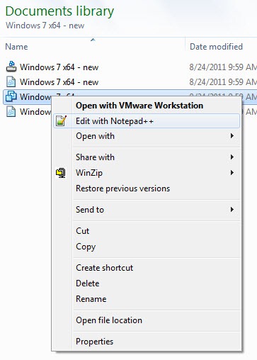 15) Once you have copy/pasted the new .VMX file into the old folder – right click on it and edit with Notepad ++