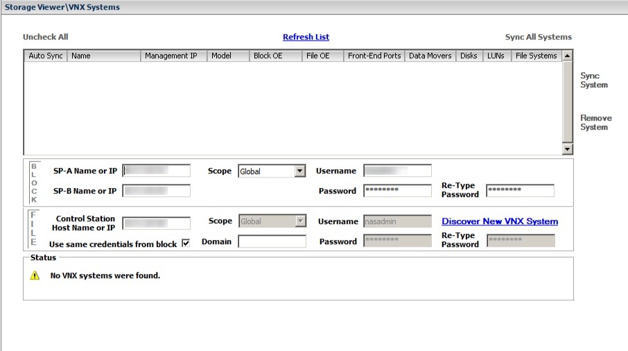4. Fill in you’re the SP-A, B as well as Control Station credentials and then click on the Discover New VNX System hyperlink to have it register with the VNX.