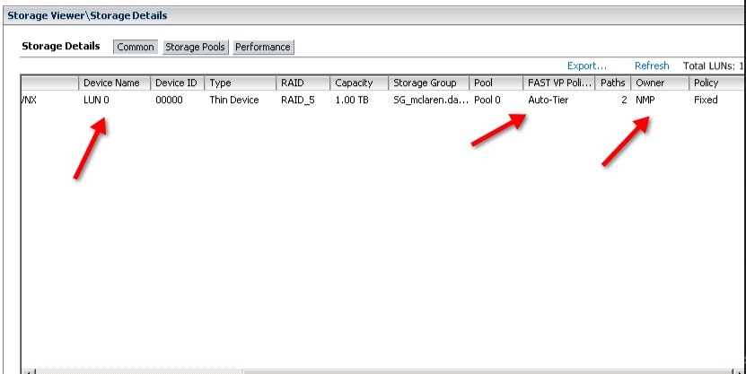 2. We also see the Pool information, what it is setup with in the FAST VP Pool, how many paths to the datastore as well as what sort of Multipathing policy is setup for this. I’ll have a future blog that will take you through how to change this pathing policy all sorts of different ways.