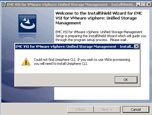3.First thing it does is yells at us about not having the Unishphere CLI installed. We skipped that since I wasn’t going to show any VNXe stuff, but if you installed it you wouldn’t be seeing this message. If you eventually want to add it, it’s not big deal just download, and run it and the USM will see it. Easy Peasy.