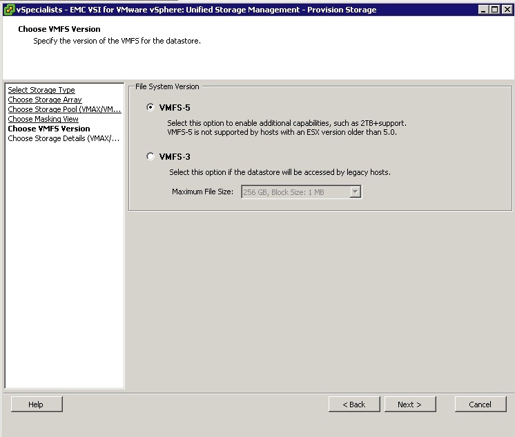 6.Select the VMFS File Version you want to use – NOTE: the default takes you to VMFS-3 – so change it to VMFS-5 if you are running vSphere 5 and then click next.
