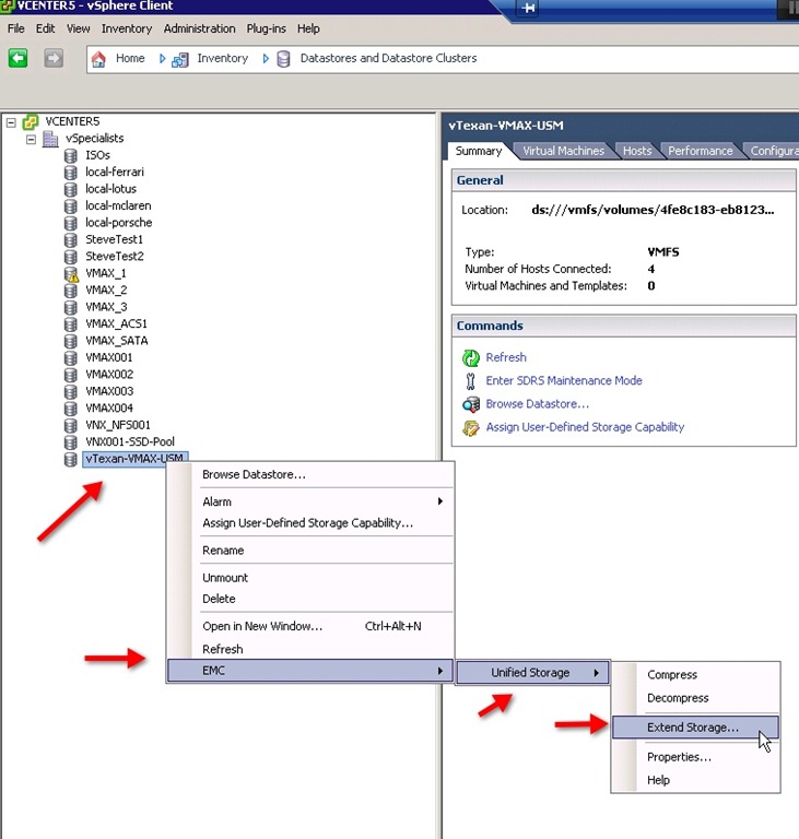 11. let’s say you want to extend this volume down the road. EASY PEASY – Right click on the Datastore – select EMC – Unified Storage – and Extend Storage: