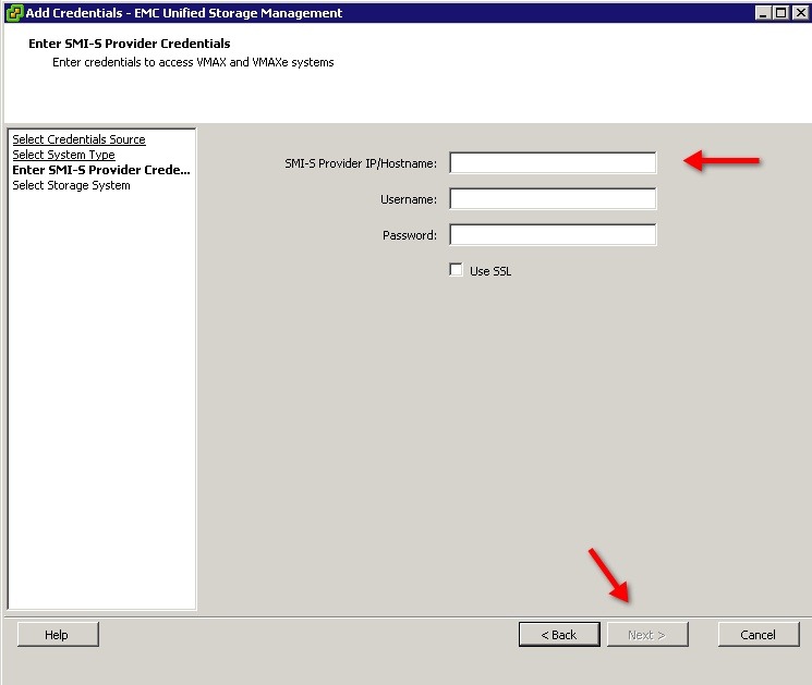5. This is the fun part – if you haven’t setup the SMI-S provider on your VMAX – check out the following blog post that takes you through the process: http://www.virtualpro.co.uk/2011/12/20/configuring-vasa-with-emc-arrays-%E2%80%93-clariion-vnx-and-vmax/ – Skip down to the SE / SMI-S server deployment process. Just download the latest and greatest version. Once you are done, go back to the vSphere Client and enter in the credentials.