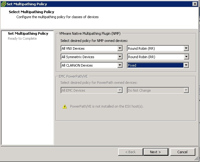 By the way, if you are unsure of what native multipathing solution you should use for a given EMC product and version of vSphere, I can’t express how important it is to check out Clint Kitson’s awesome overview and background information on what choices you have, as well as what some of the failure scenarios you need to pay attention to based on a give NMP. You can find his blog post here: