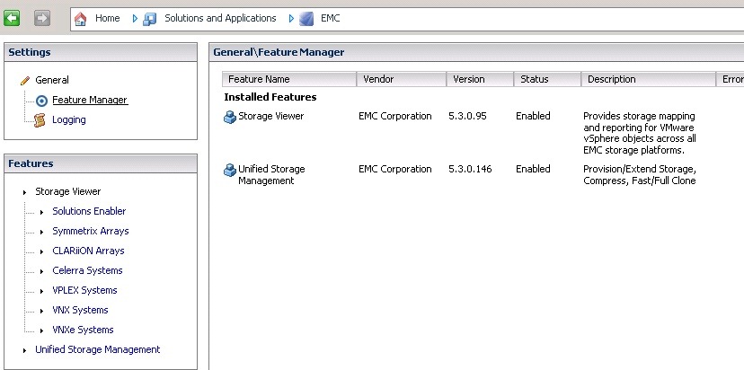 Now lets open up vSphere Client and make sure it hasn’t already been installed – go to Home-Solutions and Applications- EMC and see what you have installed. In this case we show Storage Viewer and Unified Storage Management installed but no Path Management: