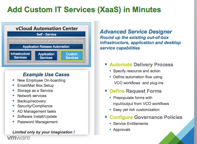 Last week I had an awesome opportunity to attend a VMware vCloud Automation Center (vCAC) bootcamp put on by the VMware team.   If you aren’t familiar with vCAC, it can beimage described as an Enterprise wide IT Portal that helps customers deliver on the “Software Defined Datacenters” promise around IT as a Service.   The lynchpin to any sort of successful “IT as a Service” (ITaaS) offering is the workflow engine.  In the case of VMware, the Workflow engine has sort of been the “red-headed step-child” of their offering and honestly more people OUTSIDE of VMware know, love, and evangelize this product than most inside of VMware.  I’m talking about VMware vCenter Orchestrator or vCO for short.  Over the years I started hearing from people like Cody Bunch (@Cody_Bunch), James Bowling (@vSential ) and others speak to the power of vCO and how they were using it but it always seemed “interesting” to me, but not compelling.  Fast forward to these last 18 months it’s clear that in order to get ITaaS you must have a pretty robust workflow engine and vCO is a VERY robust offering.  Oh ya, vCO is also FREE with your vCenter Purchase !
